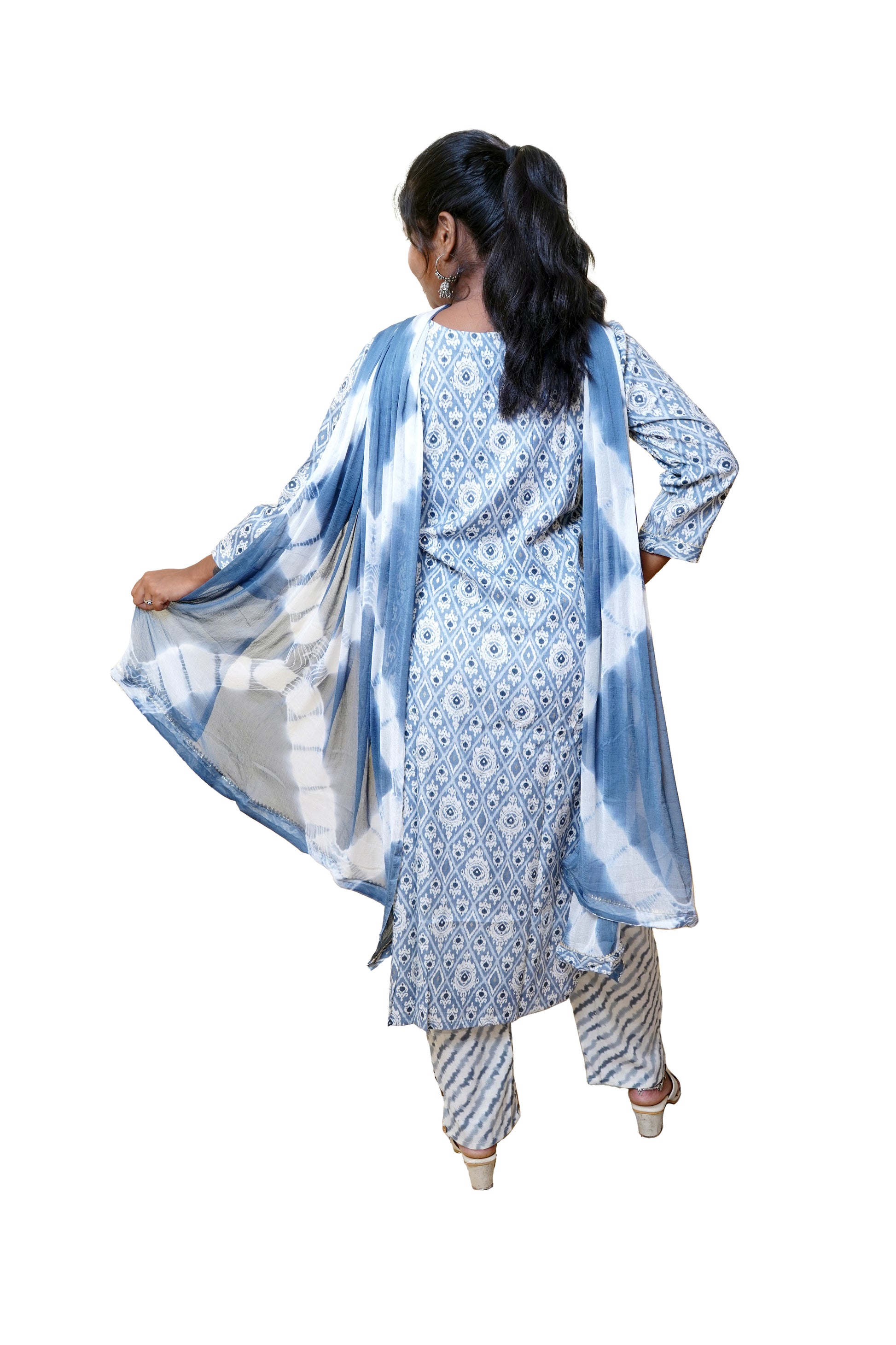 The Amira Ikkat Blue Suit Set is a beautiful fusion of traditional craftsmanship and modern style. Featuring a stunning ikkat pattern in a rich blue tone, this set is both vibrant and elegant. The intricate design adds a touch of heritage, while the contemporary cut of the kurta offers a flattering and comfortable fit. Paired with matching pants and a delicate dupatta, the set creates a harmonious and sophisticated look. Ideal for weddings, festivals, or any special occasion, the Amira Ikkat Blue Suit Set is a perfect choice for those looking to blend cultural richness with contemporary flair.